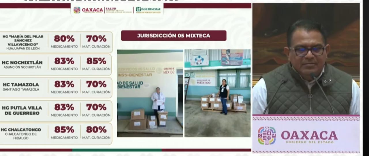 07 de enero. El coordinador del Instituto Mexicano del Seguro Social (IMSS-Bienestar) en Oaxaca, Alejandro Ramírez Figueroa, informó que en el inicio de 2026 las seis jurisdicciones sanitarias en la entidad, los 767 Centros de Salud y los Hospitales, inician su operación con un 80 por ciento de abasto de medicamentos para atender a la