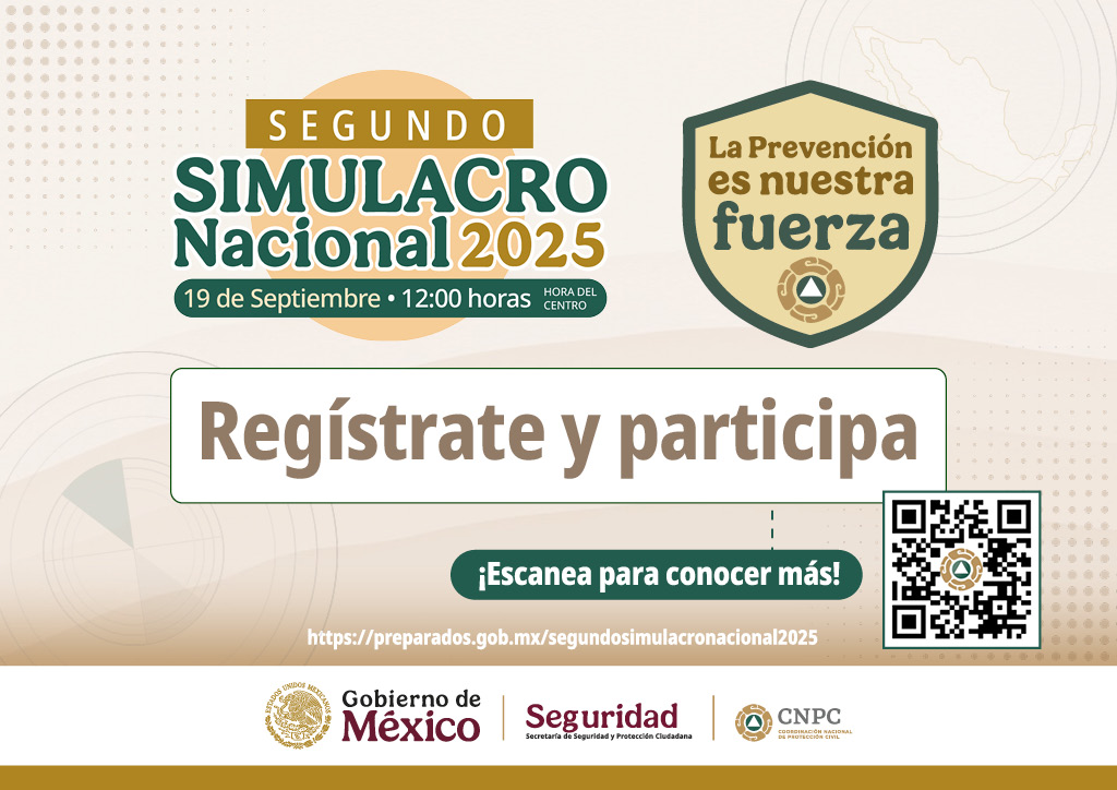 10 de septiembre. La Coordinación Nacional de Protección Civil convocó a la ciudadanía en general a participar en el Simulacro Nacional 2025 que se llevará a cabo el 19 de septiembre a las 12 del día para contribuir al fortalecimiento de las capacidades de reacción de las unidades internas y sus brigadas ante la eventualidad de una emergencia o desastre.