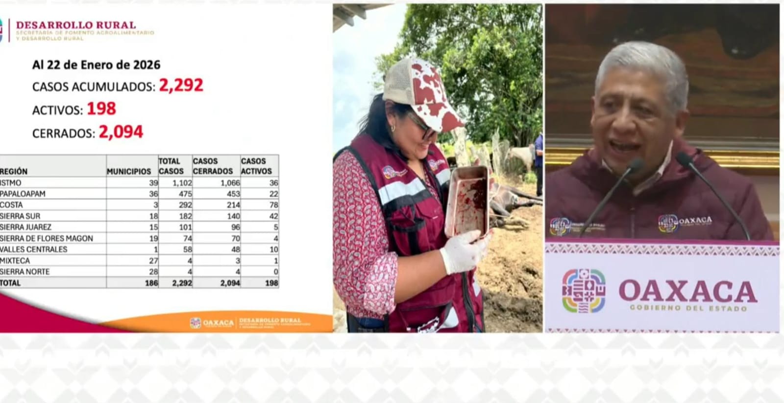 Expresó que hasta el momento los casos presentados en la Mixteca que son menores a diferencia de la Costa, el Istmo de Tehuantepec y la Cuenca, bajo los protocolos y normas oficiales del Servicio Nacional de Sanidad, Inocuidad y y Calidad Agroalimentaria (Senasica), se han dado atención a los animales que han presentado gusano barrenador los cuáles han sido dados de alta sin que hasta el momento se presente ninguna muerte del ganado por esa causa.