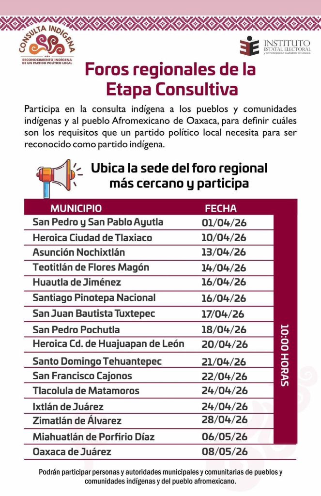 Subrayó que el calendario contempla sedes estratégicas, destacando que para la región de la Mixteca, el foro se llevará a cabo en la Huajuapan de León el próximo 20 de abril a las 10:00 de la mañana, donde se espera una participación activa de las autoridades municipales y comunitarias.