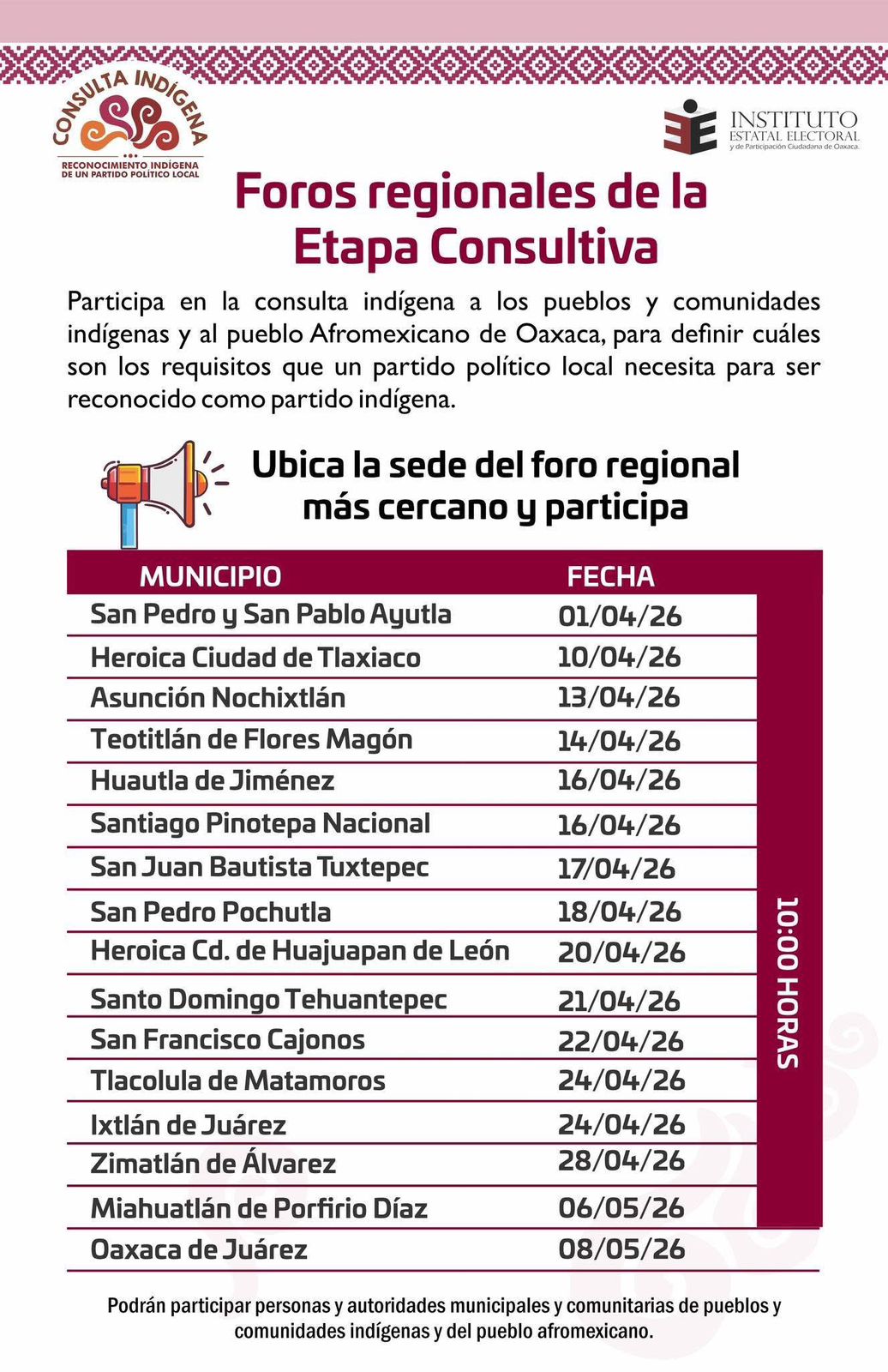 Mencionó que durante el desarrollo de estos foros, que recorrerán las diversas regiones del estado durante abril y mayo, se abordarán temas críticos como los mecanismos de validación de la autoadscripción calificada para evitar la usurpación de candidaturas.