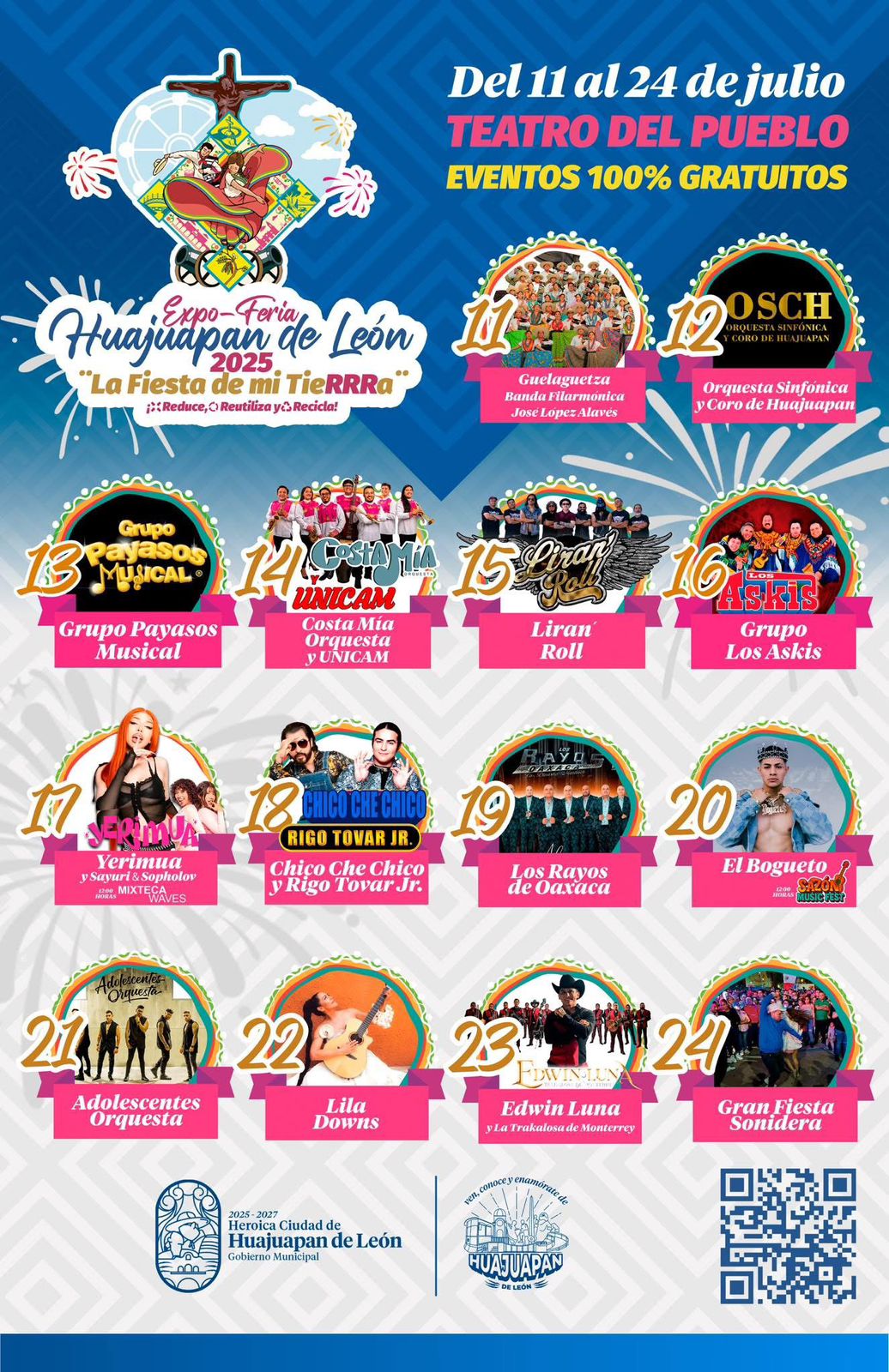 Los artistas que se presentarán en el Teatro del Pueblos son: viernes 11 de julio La Guelaguetza, Banda Filarmónica José López Alavéz; el sábado 12 de julio la Orquesta Sinfónica y Coro de Huajuapan; el domingo 13 de julio el Grupo Payasos Musical; lunes 14 de julio Costa Mía Orquesta y UNICAM; el martes 15 de julio Liran´ Roll; y el miércoles 16 de julio Los Askis.