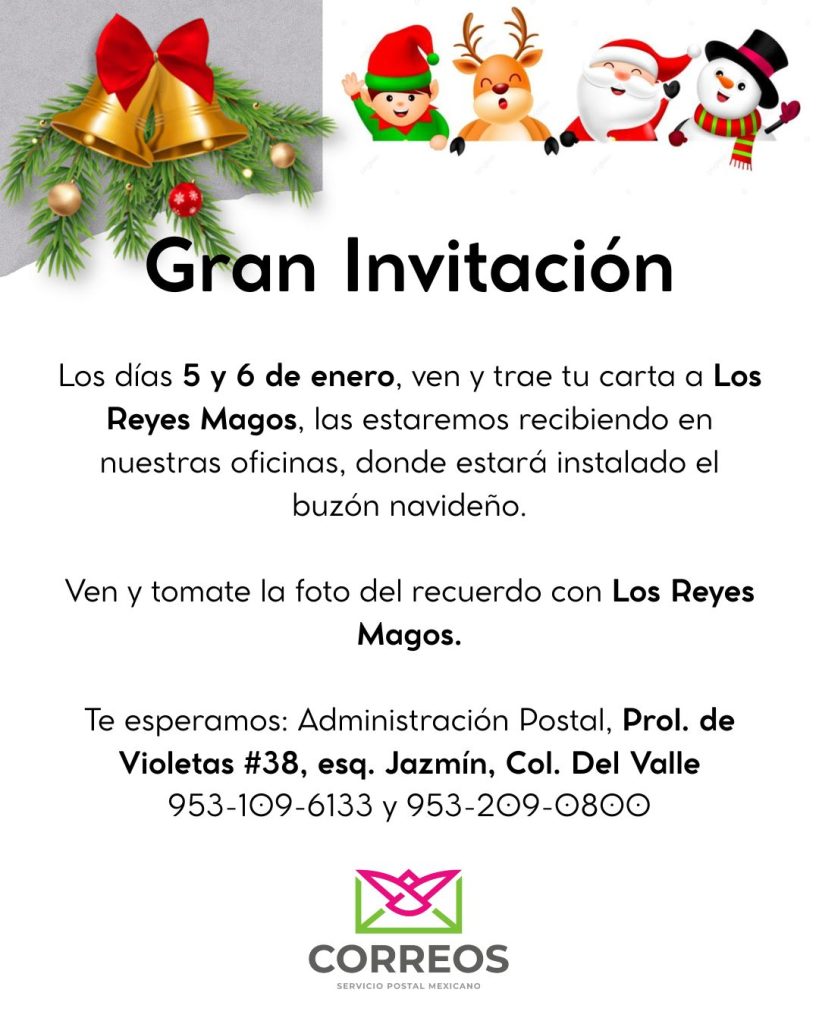 Al respecto, el encargado de Correos en Huajuapan, Miguel Peña Fernández, mencionó que los días 5 y 6 de enero los pequeños podrán dejar su carta en las instalaciones, ubicadas en la Prolongación de Violetas #38 esquina Jazmín colonia Del Valle, con un horario de 9 de la mañana a 2 de la tarde.