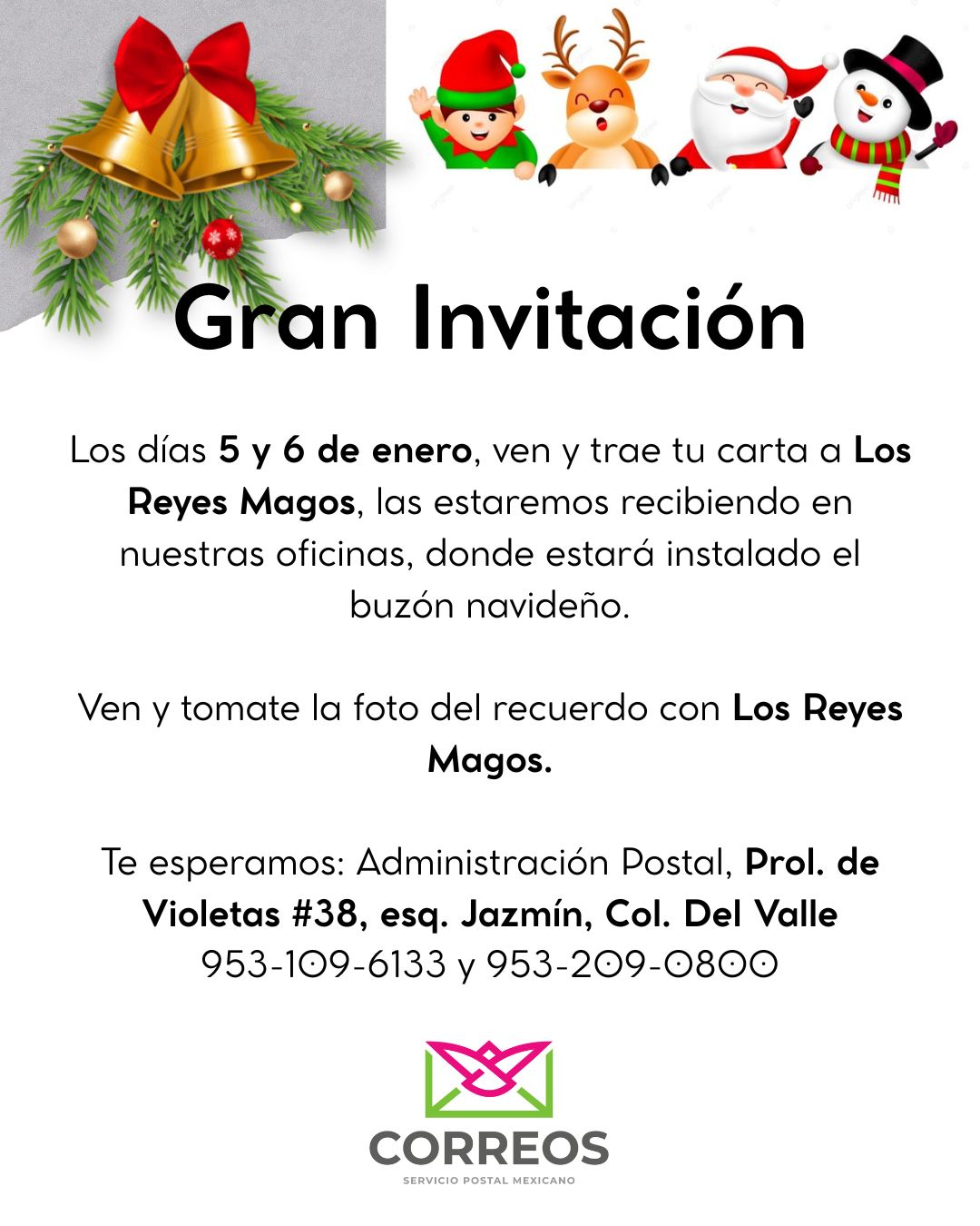 05 de enero. Los tres Reyes Magos llegan a Correos de México delegación Huajuapan, para festejar una de las fechas más esperada por todos los niños.