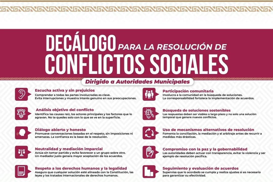 El titular de la Sego, Jesús Romero López, informó que el decálogo se basa en diez puntos que son: la escucha activa y sin prejuicios; análisis objetivo del conflicto; diálogo abierto y honesto; neutralidad y medición imparcial; y respecto a los derechos humanos y la legalidad.