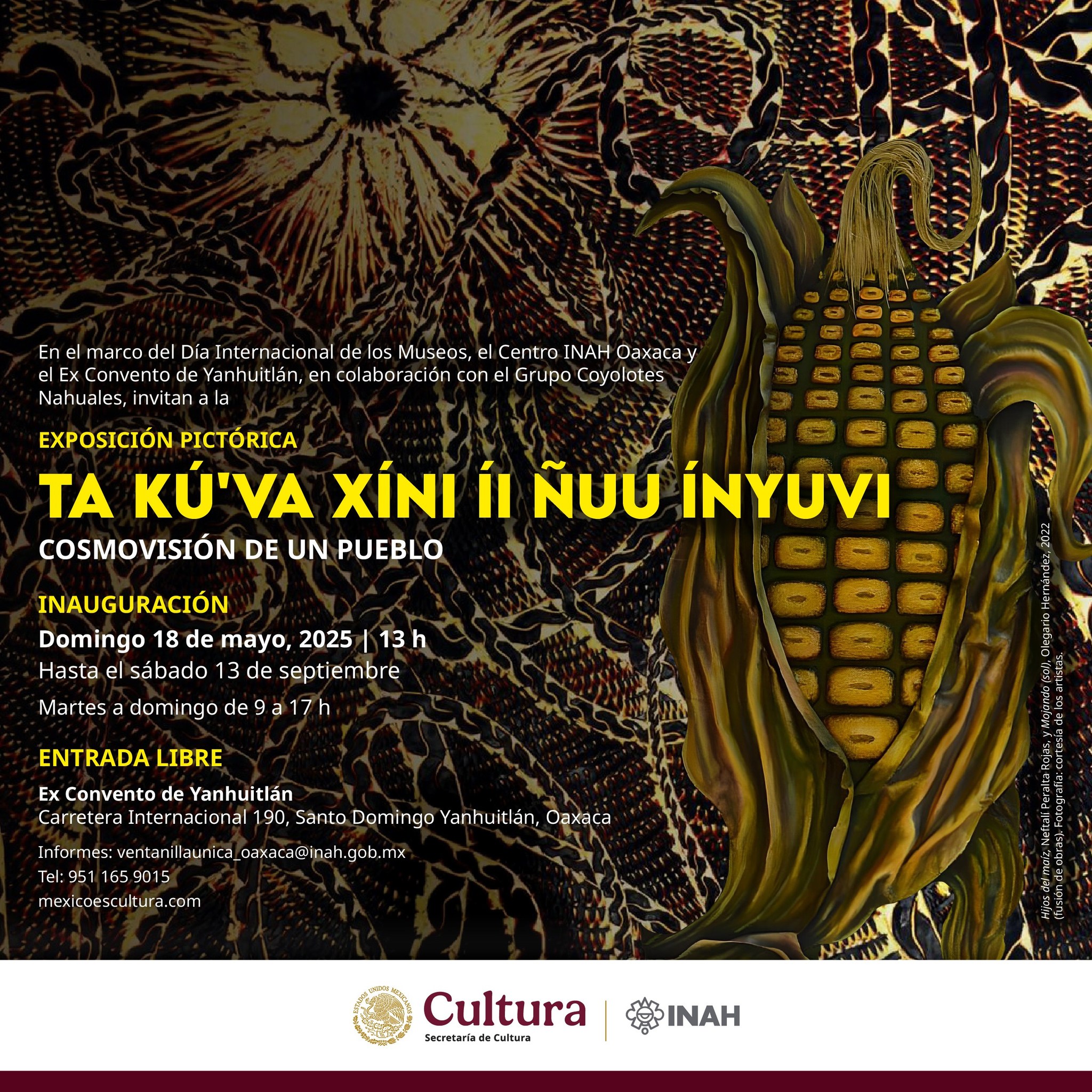 16 de mayo. Más de 20 artistas participarán en la exposición pictórica “Cosmovisión de un pueblo” en el Ex convento de Yanhuitlán como parte de la celebración del Día Internacional del los Museos que destaca a dichos espacios como intercambios de cultura, desarrollo sostenible e inclusión.