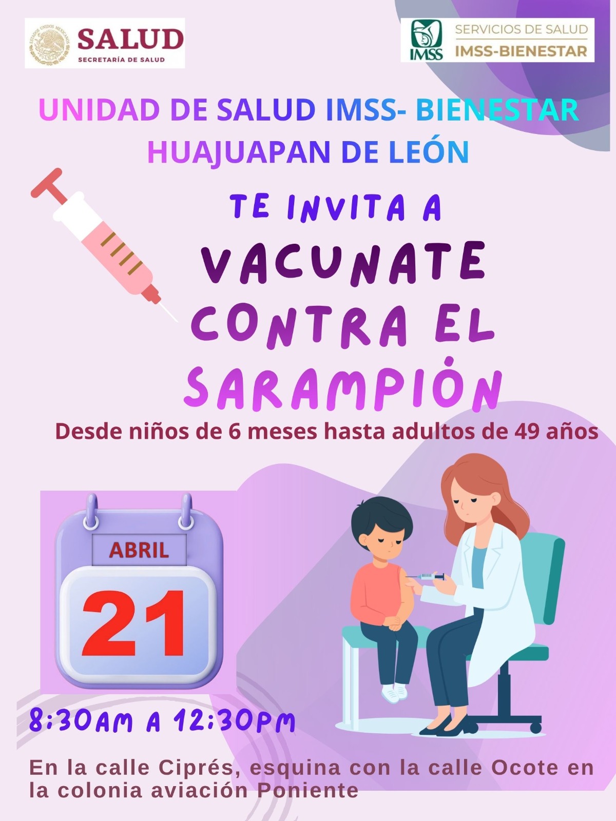 Mencionó que el martes y miércoles realizarán dos jornadas, instalando puestos de vacunación en la calle Ciprés esquina con la calle Ocote en la colonia Aviación Poniente. Así como en la carretera Huajuapan-Mariscala y calle Diego Rivera, colonia Los Pinos.