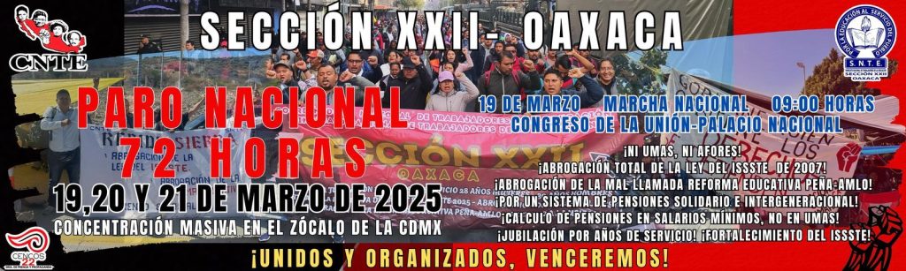 17 de marzo. El secretario de Prensa y Propaganda de la Sección 22, Luis Alberto López Pazos, informó que analizarán un paro de labores, debido al incumplimiento de sus demandas por parte del gobierno federal.