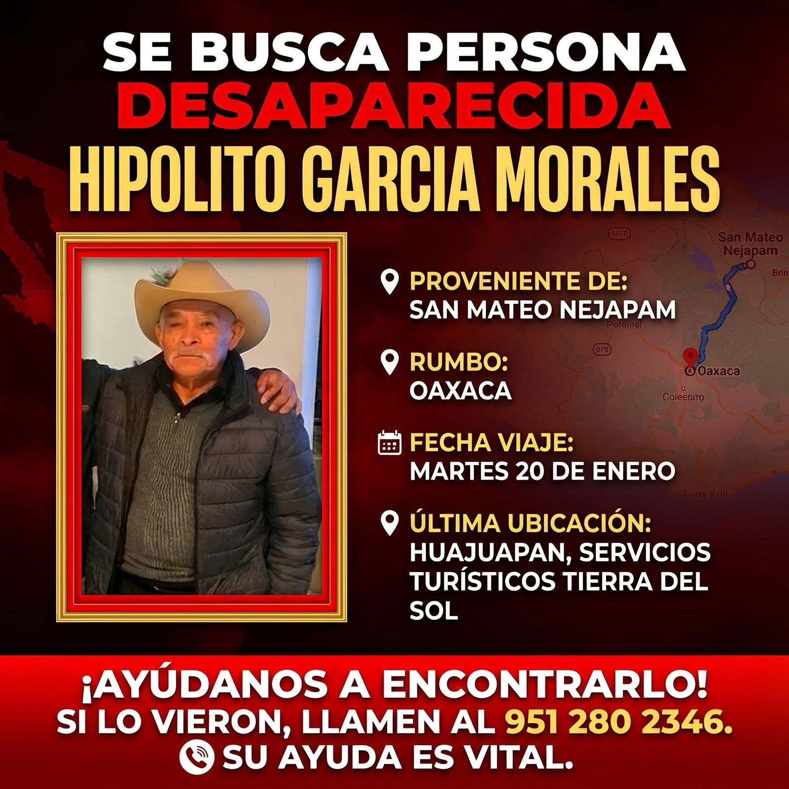 21 de enero. Un hombre identificado como Hipólito García Morales de 81 años de edad, originario de San Mateo Nejapam, desapareció ayer en la calle Nuyóo en el centro de Huajuapan de León.