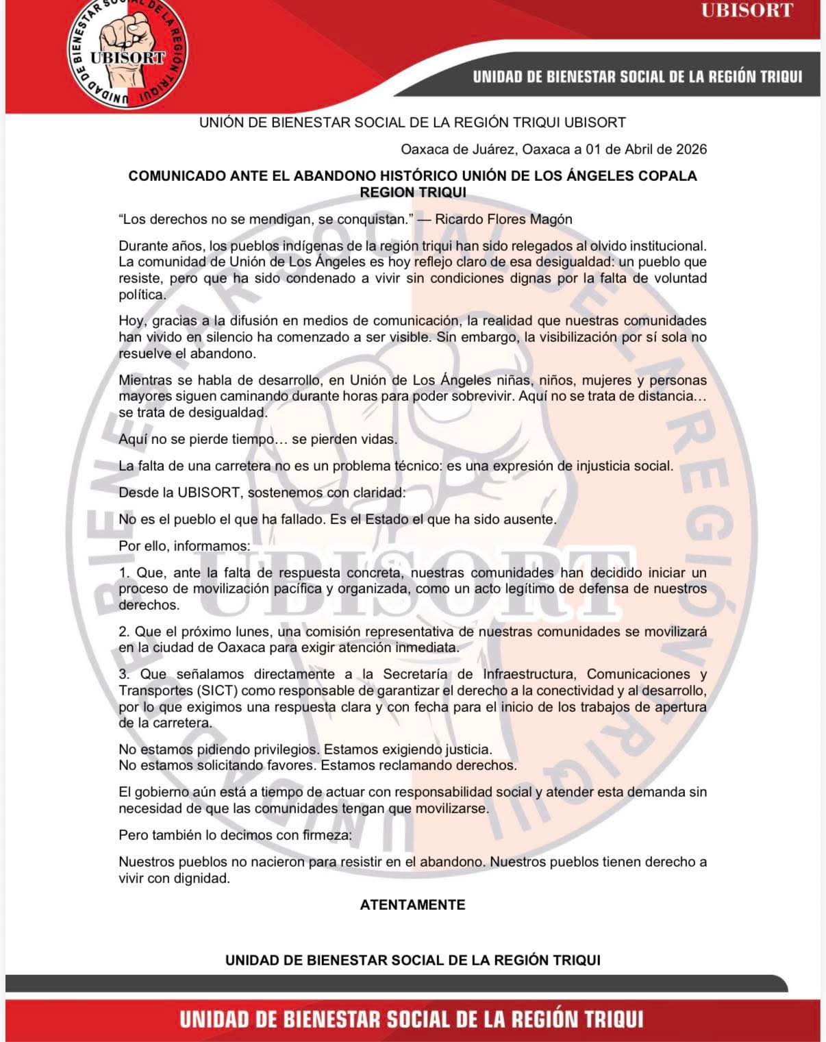 03 de abril. A través de un comunicado, la Unidad de Bienestar Social de la Región Triqui (Ubisort), advirtió que en los próximos días realizará movilizaciones y protestas, para exigir al Gobierno estatal se dé cumplimiento al acuerdo relativo a la apertura del camino para llear a la comunidad de La Unión de los Ángeles.